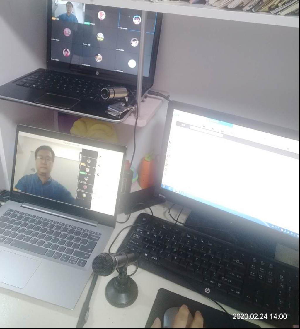 利用“腾讯会议”为主教学平台进行教学直播,通过QQ群布置教学(预定会议)时间,备用QQ群屏幕分享直播,结合超星学习通教学。左图左下为主电脑,进行腾讯会议教学直播,左上电脑作为员工登录腾讯会议,展示员工端界面,实时显示员工学习端效果,右侧开启超星学习通及QQ,一旦“腾讯会议”故障,随时QQ直播。后侧为板书,手机可录制授课过程。