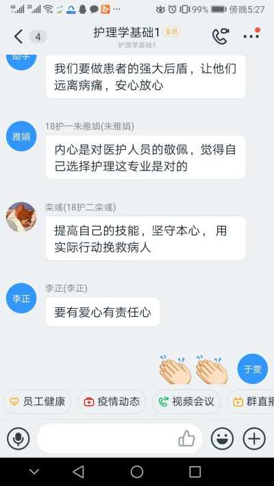 2通过钉钉平台进行直播教学。员工既可以看到PPT的展现,也可以直接听到教师讲解及引导,并通过群聊完成问题回答及教学反馈。不用站起来回答问题好像更加激发了员工发言的积极性,同学们思路非常敏捷。在直播中与同学们再次完成了一次宣誓,员工表现的非常激动。课堂讨论极其热烈。