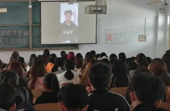 负责实习的老师对本年度护理实习基地(山东省立医院、山东省千佛山医院、烟台毓璜顶医院、德州市人民医院)做了简要介绍,要求同学按时填报实习志愿,班主任老师播放了往届实习员工对实习和就业的认知视频。