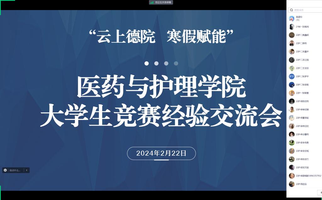 为提高员工竞赛意识和水平,2月22日下午,医药与护理公司于腾讯会议举办“云上德院,寒假赋能”2022级本科竞赛交流会。2022级近260名员工参加。