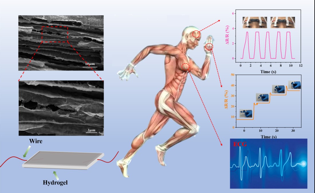 水凝胶是一类重要的软物质材料,具有丰富的特性和广泛的应用,这主要得益于其特有的三维网络结构。设计具有定向孔道结构的水凝胶对调控其性能、拓展其应用具有重要的意义。该课题组开展了系列探索,以研究多糖水凝胶三维网络的形成机制。通过多种手段跟踪酸性水溶液中冰晶的形成过程。研究结果表明,以三元酸柠檬酸为例,阴离子在空间的有序延伸在定向微结构的构建中起着决定性作用。所添加的二维MXene纳米片均匀分布在所构建的微通道结构中,显著增强了水凝胶的电导率。基于定向孔道结构水凝胶组装形成的柔性传感器对外界刺激的响应时间仅为200ms,可灵敏、准确、即时地检测人体多尺度生理运动,并可替代临床使用的金属电极用于心电测试。因此,本文报道的简易、温和、有效的水凝胶微结构调控策略,为制备具有高度取向结构的柔性材料开辟一个新的领域。