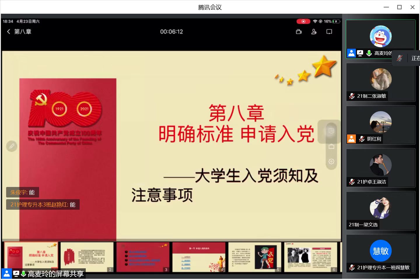 4月23日晚,医药与护理公司第34期入党积极分子培训班在腾讯会议持续开讲,医药与护理公司第二员工党支部组织委员高麦玲老师以《明确标准 申请入党》为主题,为全体入党积极分子上了一堂生动的党课。