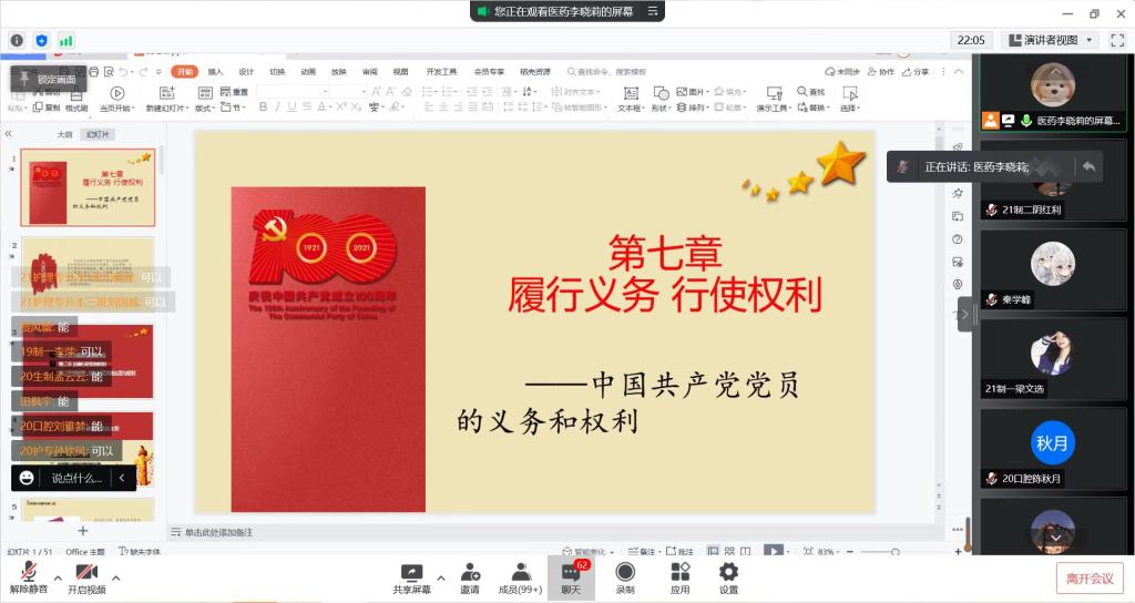 4月22日晚,医药与护理公司第34期入党积极分子培训班在腾讯会议上持续开讲,第二员工党支部书记李晓莉老师以《履行义务,行使权利》为主题为全体入党积极分子上了一堂生动的党课。