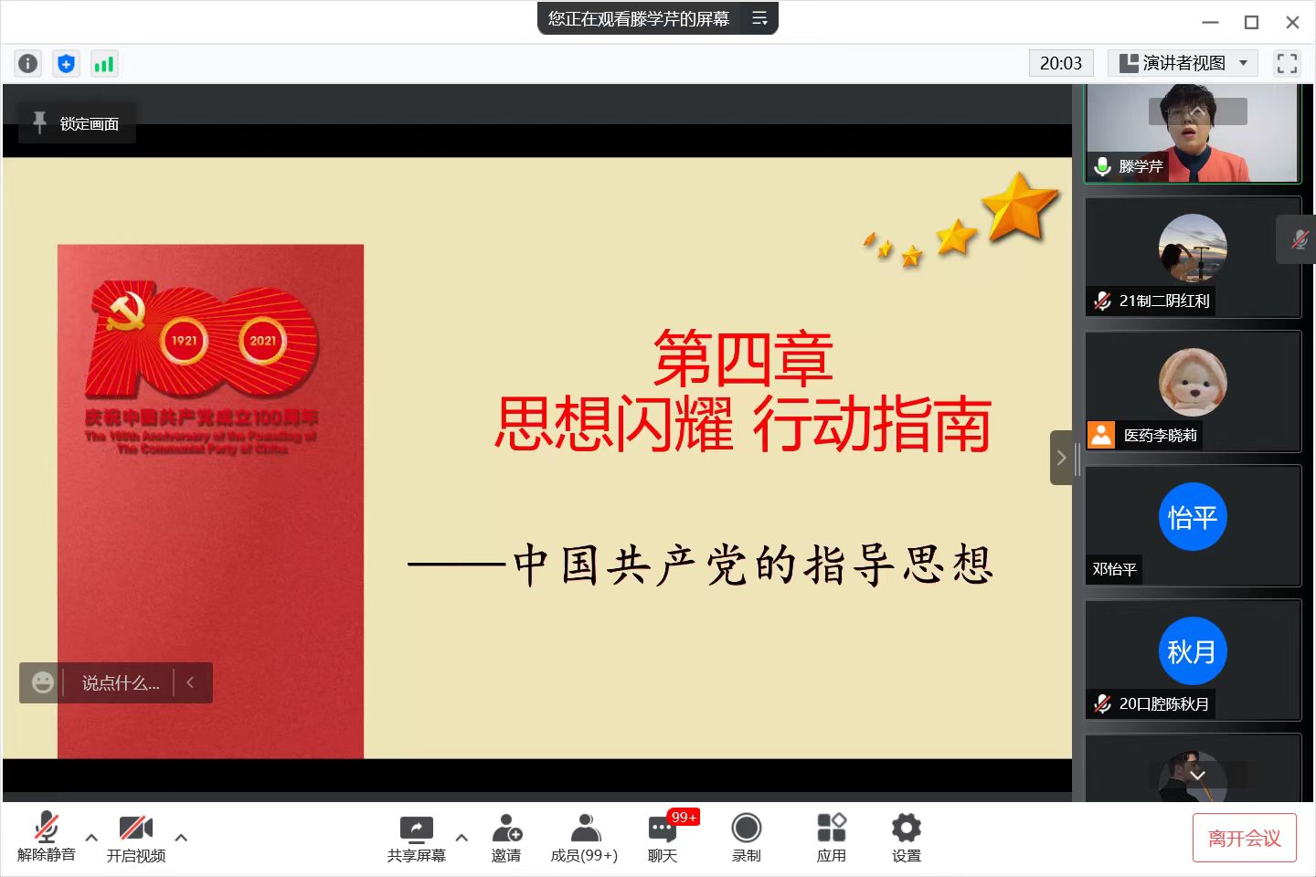 4月19日晚,医药与护理公司第34期入党积极分子培训班在腾讯会议持续开讲,教师第一党支部书记滕学芹老师以《思想闪耀 行动指南》为主题,为全体入党积极分子上了一堂生动的党课。
