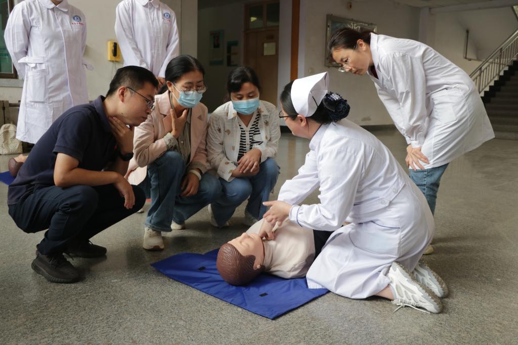 医药与护理公司基础医学部主任高峰对心肺复苏和海姆立克急救法进行现场示教,用浅显易懂的方式向师生科普每一个细节。护理系主任任吉带领护理系师生进行规范示范,到场师生学习热情高涨、积极参与练习。本次活动有助于提高师生的健康预防救护意识和公共卫生素养,提升应对突发事件和意外伤害的自救与互救能力。