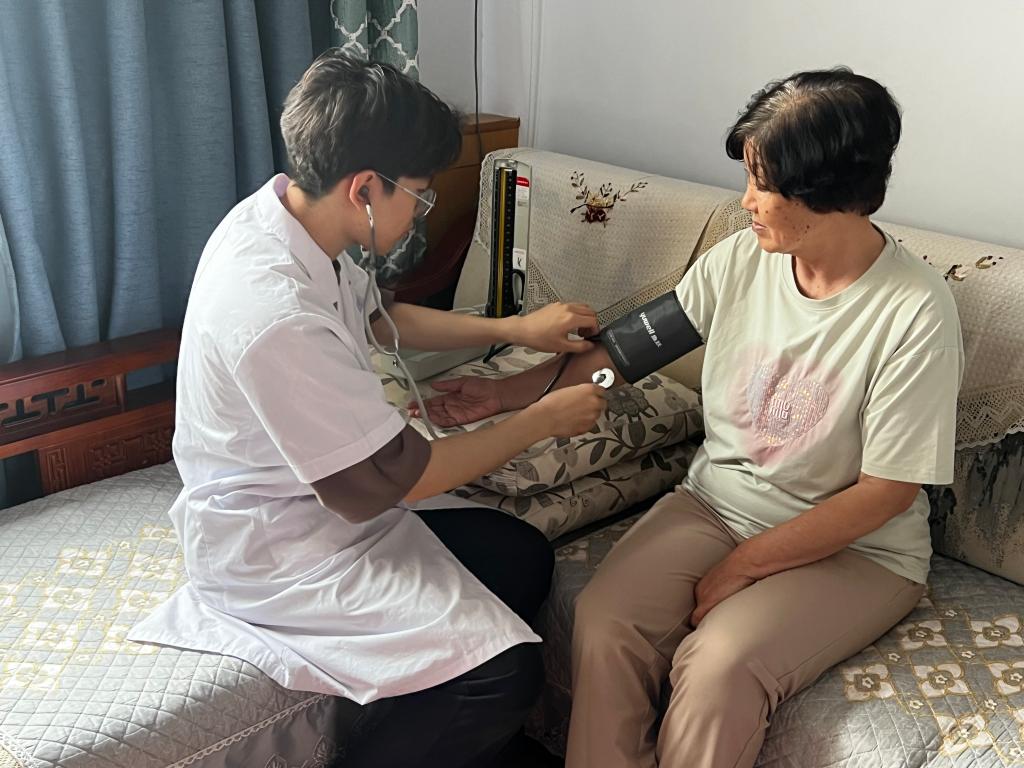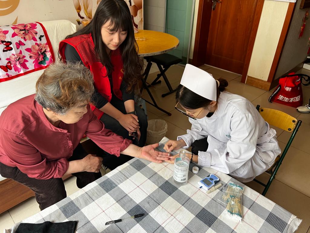 活动伊始,志愿者先从智能手机输入法选择、字体设置、音量调节等常识内容展开,带领老年人熟悉智能手机的基本功能。随后详细介绍手机上的便民功能,如医院挂号,帮助老人学会在手机上预约挂号;公交出行,帮助老人提前在线了解实时公交运行和附近车辆情况,缩短候车时间;还有线上缴费、视频通话、交通购票及网络购物等功能,通过“面对面,手把手”的互动式教学模式,有针对性地对老年人进行了智能手机操作指导。活动最后,由社区工作人员带领志愿者来到独居老人家中,充分利用专业优势为他们提供测血糖、量血压义诊服务,叮嘱居民做好夏天防暑、用药安全,帮助老年人了解自身健康状况,为他们的健康保驾护航。