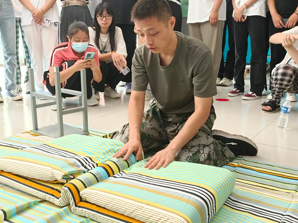 教官前往员工宿舍为同学们展示军被的正确叠法,并向他们详细讲述军训期间内务整理标准。教官一边示范一边讲解,从压被子开始,到被子的对折、折叠手法、掏平压实和如何跌出棱角等方面做了详细的示范的讲解。看着一床蓬松的被子就在简单的“叠、压、捋”几个动作之下,变成了四四方方的“豆腐块”。同学们积极实践练习,一床床有棱有角的被子开始被整齐地摆放在床头上。