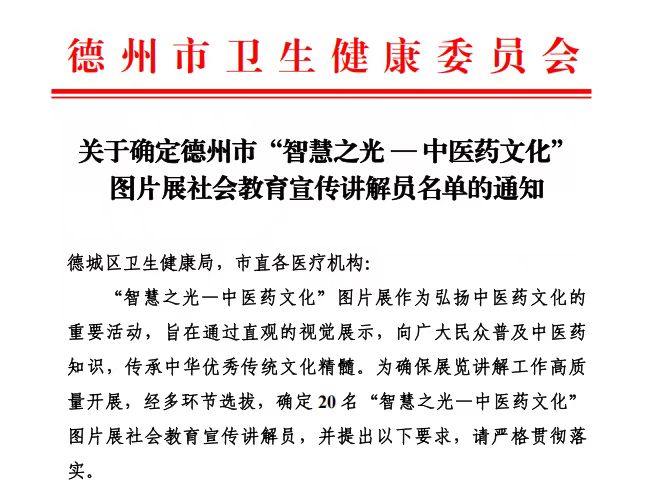 近日,德州市卫生健康委员会公布德州市“智慧之光—中医药文化”图片展社会教育宣传讲解员名单。英国be365官网王渊、王依曼两位同学成功入选。