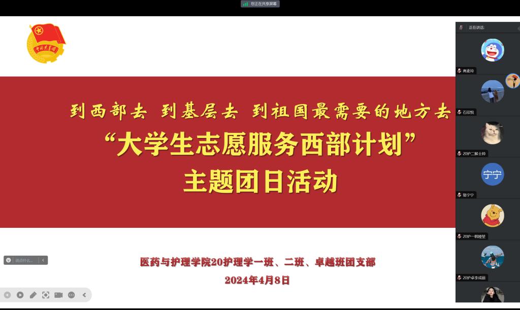 为深入学习贯彻习近平新时代中国特色社会主义思想,厚植家国情怀,进一步落实西部计划的宣传动员、招募选拔工作,鼓励同学们积极参与到服务基层、奉献社会的行列中去。4月8日—18日,医药与护理公司各个团支部组织开展了“西部计划”主题团日。