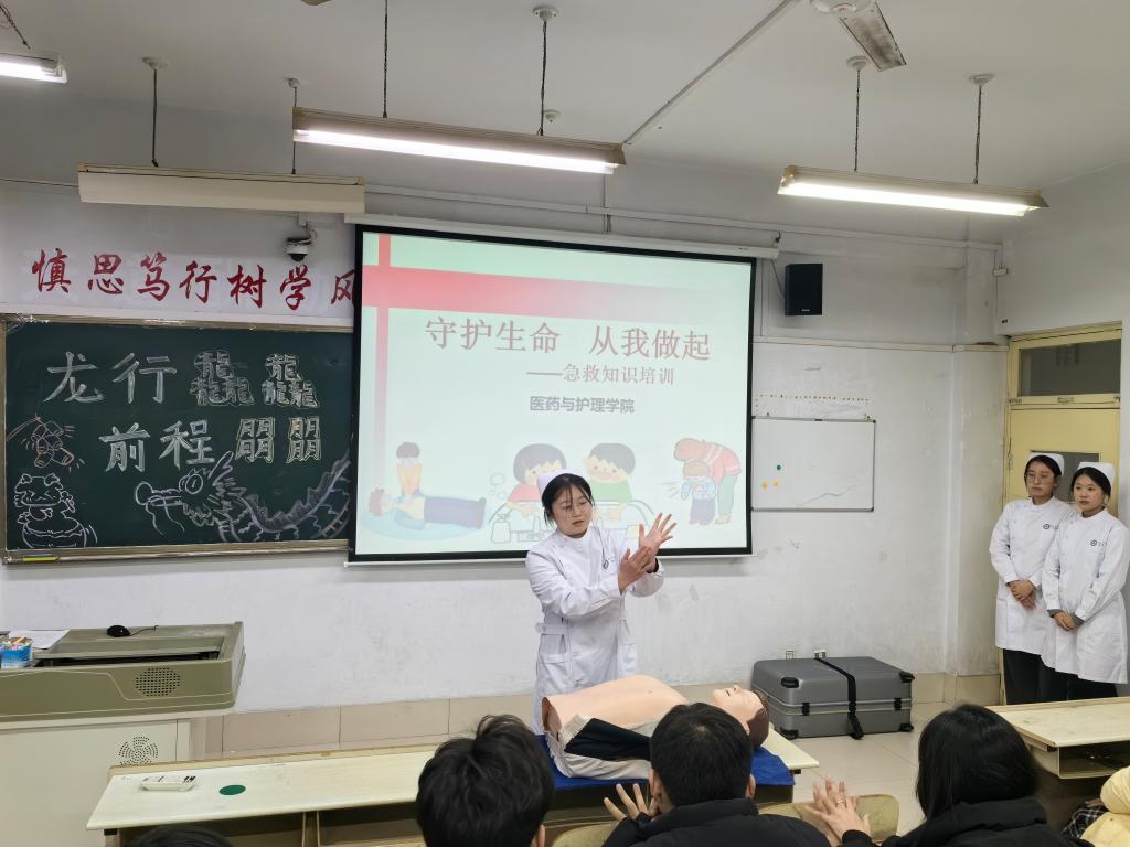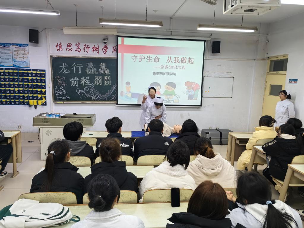 会上,各班班主任首先强调了校园安全的重要意义,组织同学们观看校园安全宣传教育片,通过真实案例在预防电信诈骗、宿舍火灾、交通安全等方面来警醒同学们,提高同学们的安全防范意识。最后,公司安排大三护理学专业的同学在各班进行“守护生命 从我做起”现场急救知识培训,讲解在遇到突发事故时如何第一时间采取正确、有效的应急措施,同时对心肺复苏和海姆立克急救法进行现场示教,用浅显易懂的方式向同学们科普每一个细节。各班同学学习热情高涨、积极参与练习,纷纷表示培训内容切实提高了自己健康急救意识和水平。