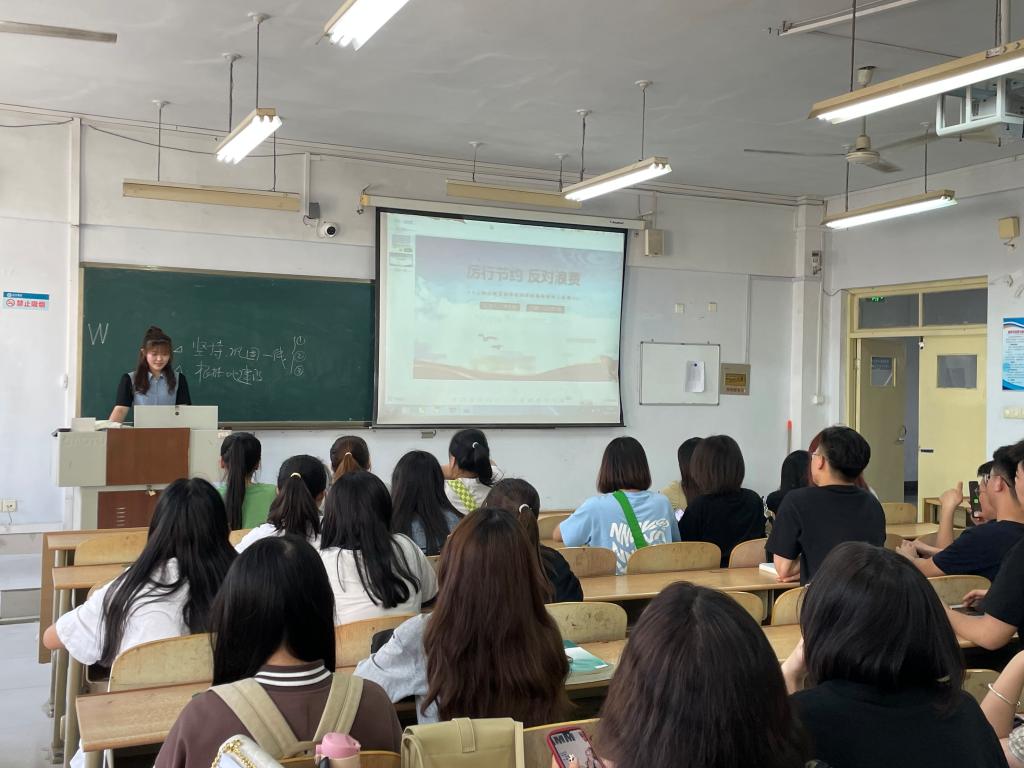 勤俭节约是中华民族传统美德,也是干事创业、兴国兴邦的重要基石。会上,主讲人从推动“光盘行动”到推广节能、节水产品,从使用绿色环保家具、建材到倡导绿色低碳出行,形成节约适度、绿色低碳、文明健康的生活方式和消费模式等方面,讲解了我国资源的现状、节约对国家的贡献、节约的具体方法等,帮助同学们避免日常生活中的浪费行为,学会如何从小事中节约,同学们也纷纷上台分享自己在日常生活中践行“厉行节约,杜绝浪费”理念的方法。