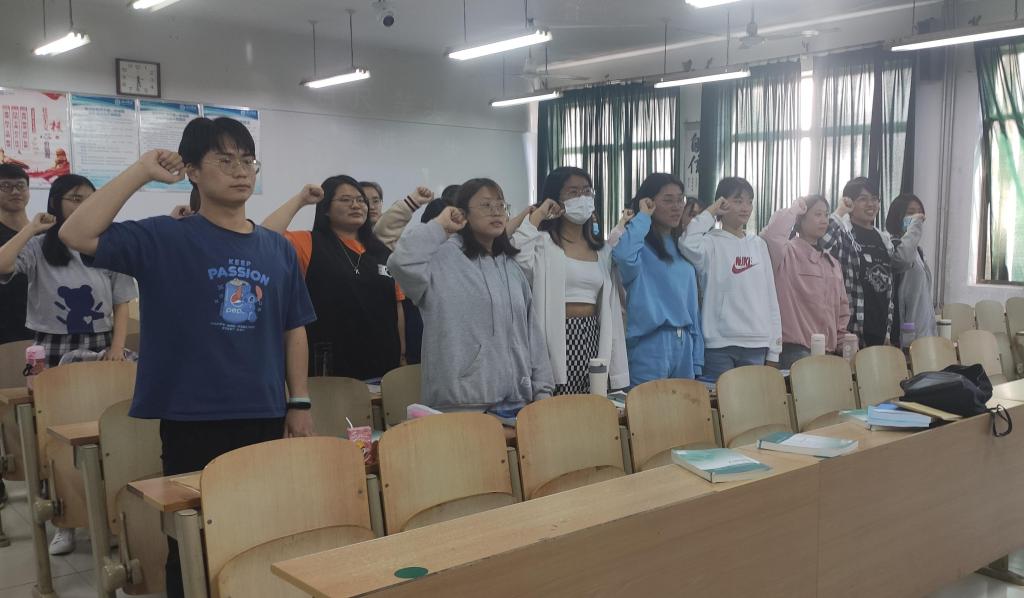 全体团员高举右手,紧握右拳,在团支书的领誓下,郑重地再次宣读入团誓词:“我志愿加入中国共产主义青年团,坚决拥护中国共产党的领导,遵守团的章程,执行团的决议,履行团员义务,严守团的纪律,勤奋学习,积极工作,吃苦在前,享受在后,为共产主义事业而奋斗!”铮铮誓词在教室内回荡,每位团员表情庄严肃穆,誓词铿锵有力!