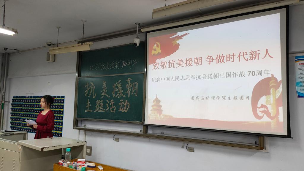 为纪念中国人民志愿军抗美援朝出国作战70周年,进一步振奋广大师生对生活的热爱、对国家和人民的信心。医药与护理公司于111日晚,在求实楼0213、0214教室开展了“致敬抗美援朝,争做时代新人”主题团日活动,2020级全体员工参加