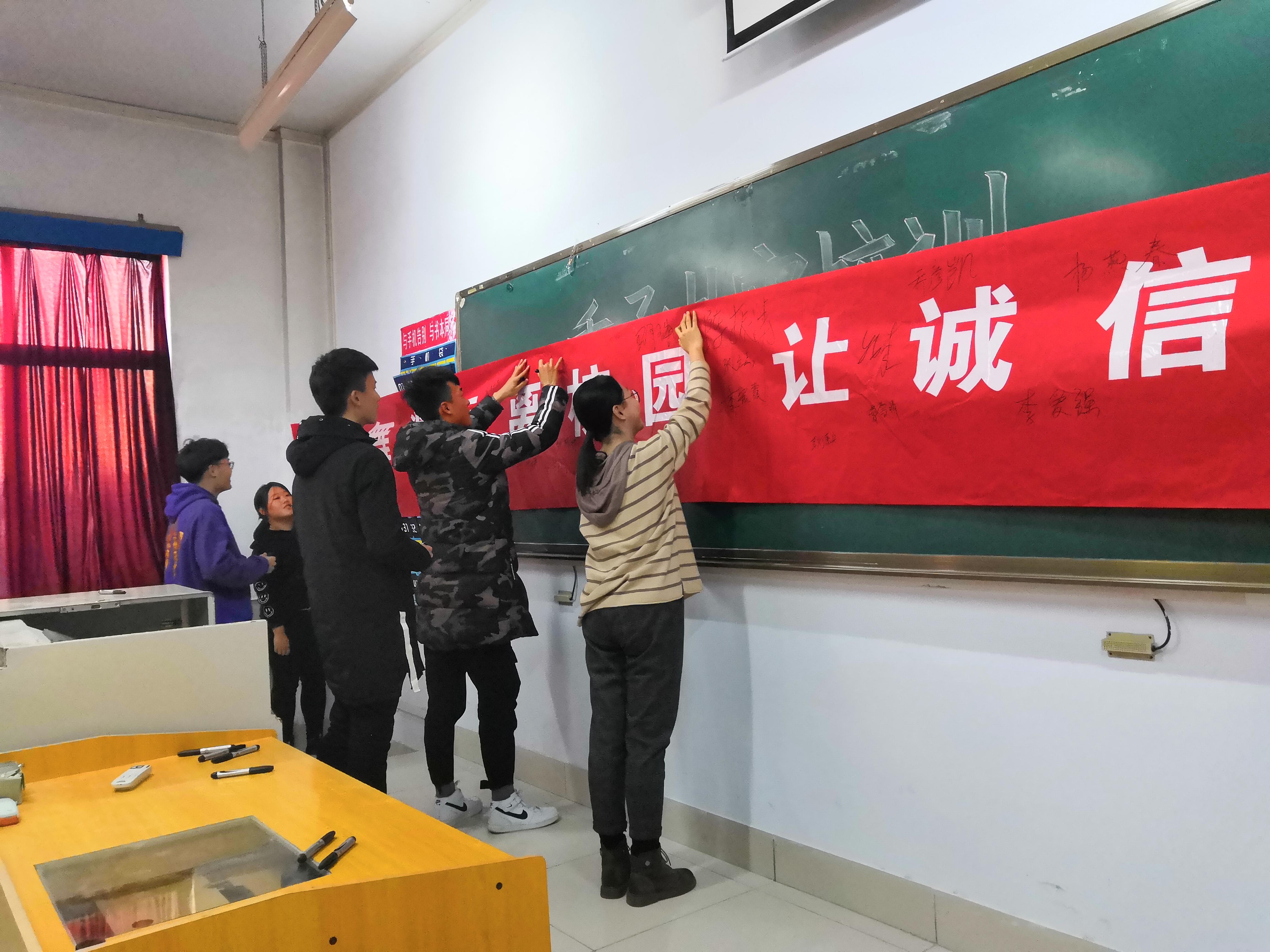活动中,孟书记结合以往作弊同学事例进行了考试考风考纪教育,希望同学们在考试中能端正态度,严肃考风考纪,诚信参加考试。随后,武珊珊老师带领同学们一起学习了考试注意事项及考试作弊处罚条例,为考生打好了预防针。之后,学习督察部成员带领全体员工进行考前宣誓,保证自己一定会诚信参加考试,绝不作弊。活动最后,与会成员在诚信考试横幅标语上进行签字仪式。