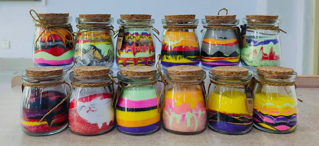 活动负责人向大家展示了色彩的情绪密码,开启了同学们的认知之门。例如蓝色代表平静从而缓解焦虑,红色能促进多巴胺分泌等。实操环节配备专业工具包,包含12色天然矿物彩砂、水晶滴胶及定制玻璃瓶。制作过程中,活动负责人引导大家进行正念冥想:“回忆最近令你心动的瞬间,让指尖的色彩替你诉说。”随着彩砂层层堆叠,有人用橘红渐变演绎竞赛获奖的喜悦,有人以蓝白漩涡记录考研复习的心路。活动特别设置“盲盒交换”环节,同学们互相分享彼此的心境,他们纷纷表示理解了情绪如流沙,越是紧握越易流逝,学会接纳才是管理关键。