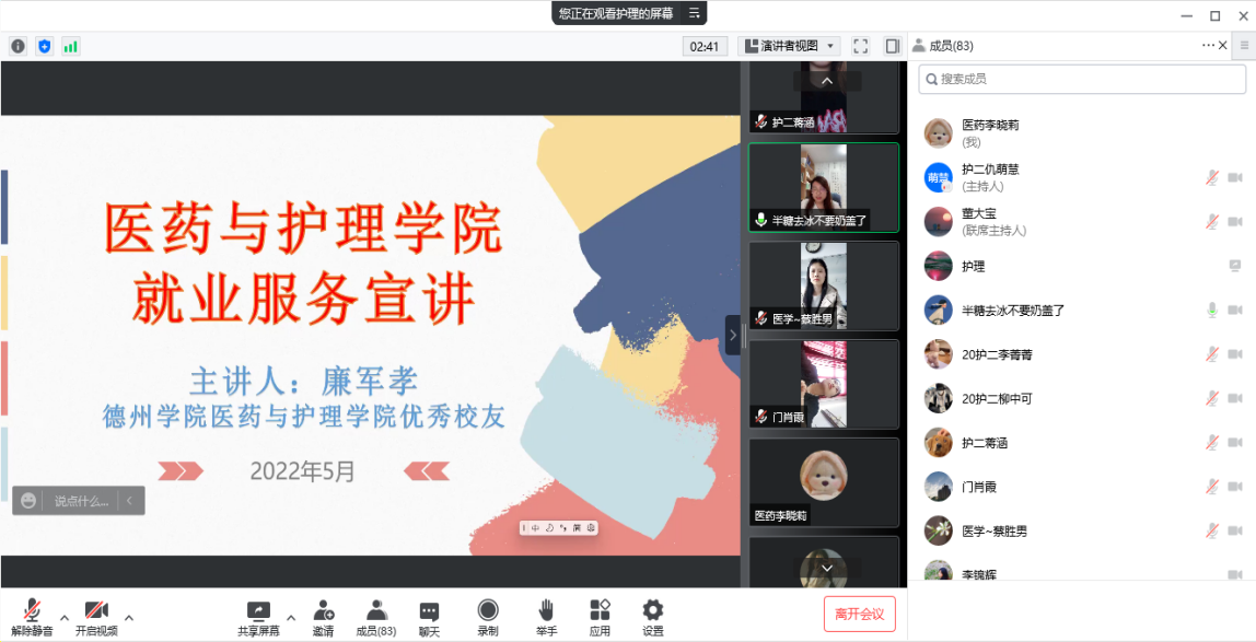 活动现场特邀2008级优秀员工、天津医院创伤骨科足踝外科、中华护理学会骨科专科护士、天津市护理学会骨科专委会委员廉军孝进行云端指导。廉军孝首先向同学们分享了自己的考研经历和临床试检。随后,对目前护理学就业形势进行分析,聚焦到引发毕业生深思的“就业在即,如何进行选择”。引导同学积极就业,对毕业生们提出殷切希望。最后,就天津医院的护理文化、护理团队建设、护士职业发展等各角度全面介绍了护理工作特色,向今年护理学毕业生展示了广阔的职业发展前景。