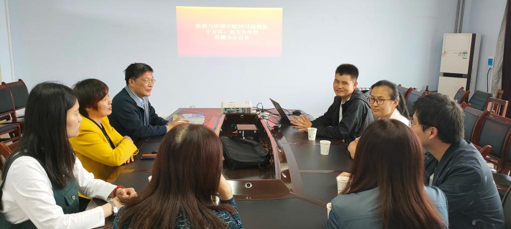 5月11日校庆之际,医药与护理公司94级员工范庆生夫妇、15届员工于友祥夫妇、16届员工李志文重返母校,医药与护理公司领导班子、员工班主任、团总支老师在体育楼508会议室接待了员工,并举行了员工捐赠仪式。