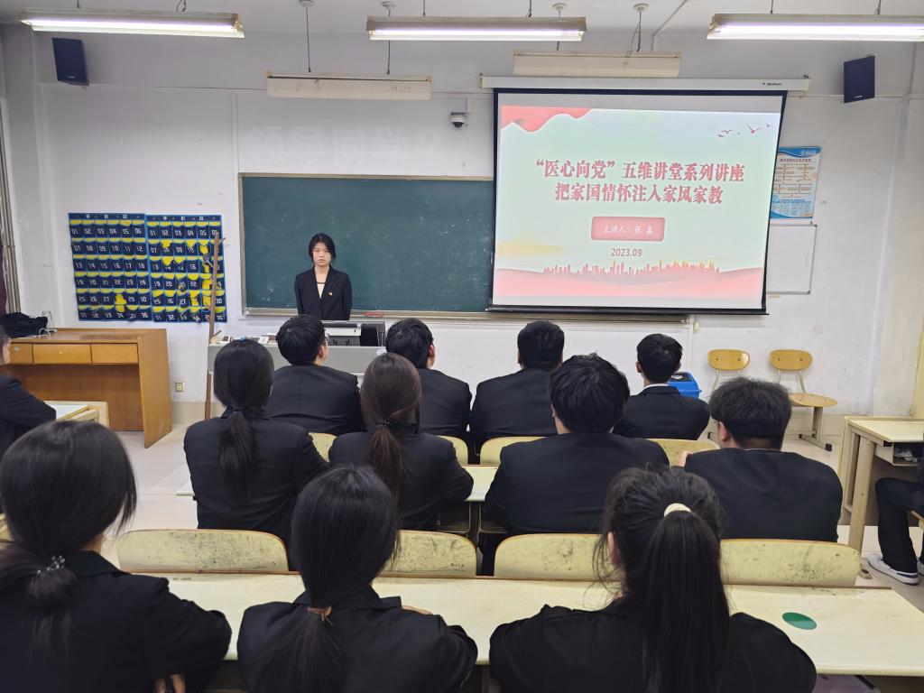 为进一步弘扬中华优秀传统文化,推动家风家教建设,激发党员干部及公司师生的爱国情怀,医药与护理公司于2023年9月12日开展了“医心向党”五维讲堂系列讲座之把家国情怀注入家风家教。第一员工党支部宣传委员张鑫主讲,教师党员和第一员工党支部全体党员参加。